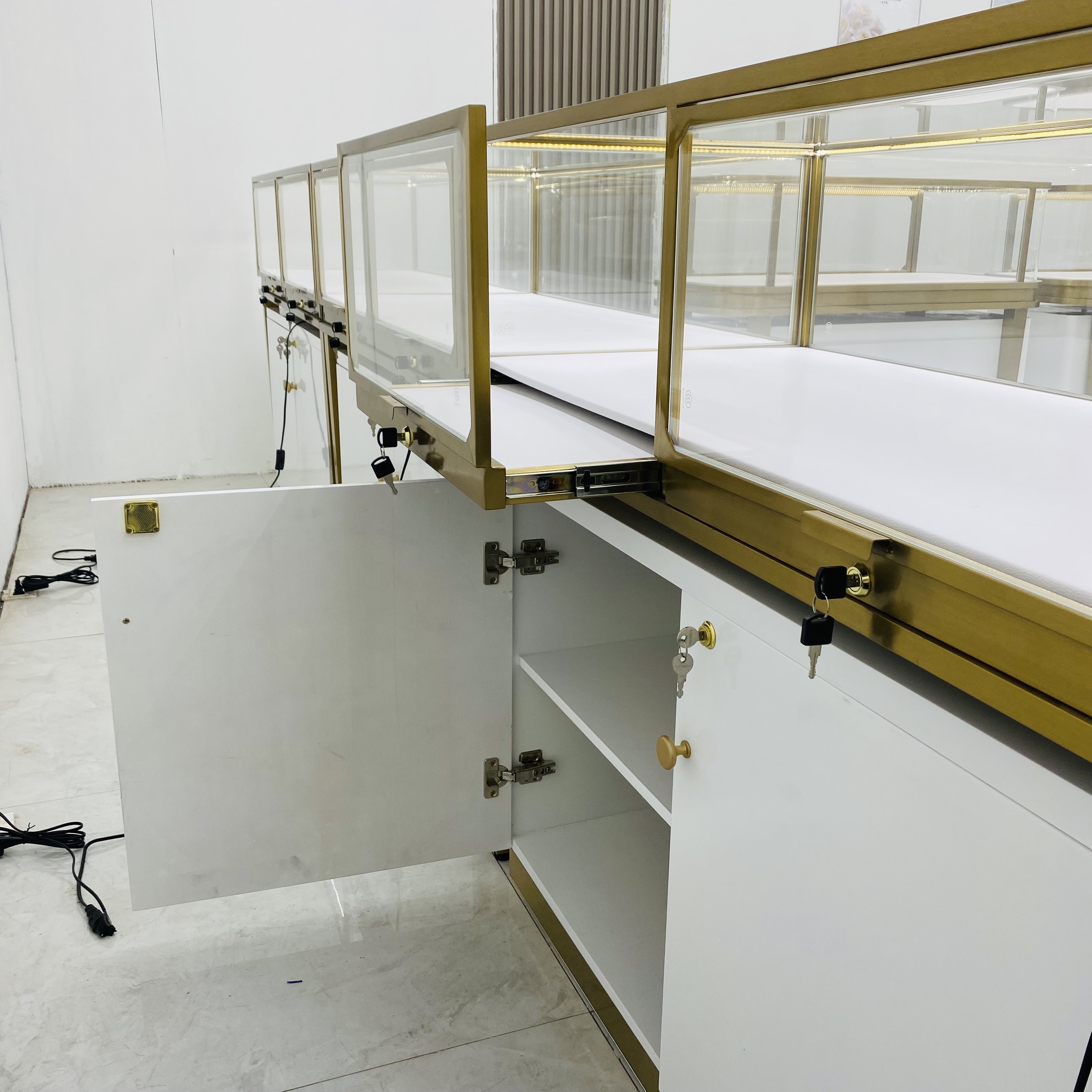 The Champagne Gold Jewelry Display Cabinet is a luxurious and sophisticated storage solution designed specifically to showcase precious jewelry. Made from high-quality materials, this display cabinet offers both durability and elegance, making it the perfect addition to high-end jewelry boutiques, luxury homes, and art galleries. Featuring customizable storage options and adjustable lighting, it ensures your jewelry is displayed securely and attractively. Inquire today to enhance your display space with this stunning piece.