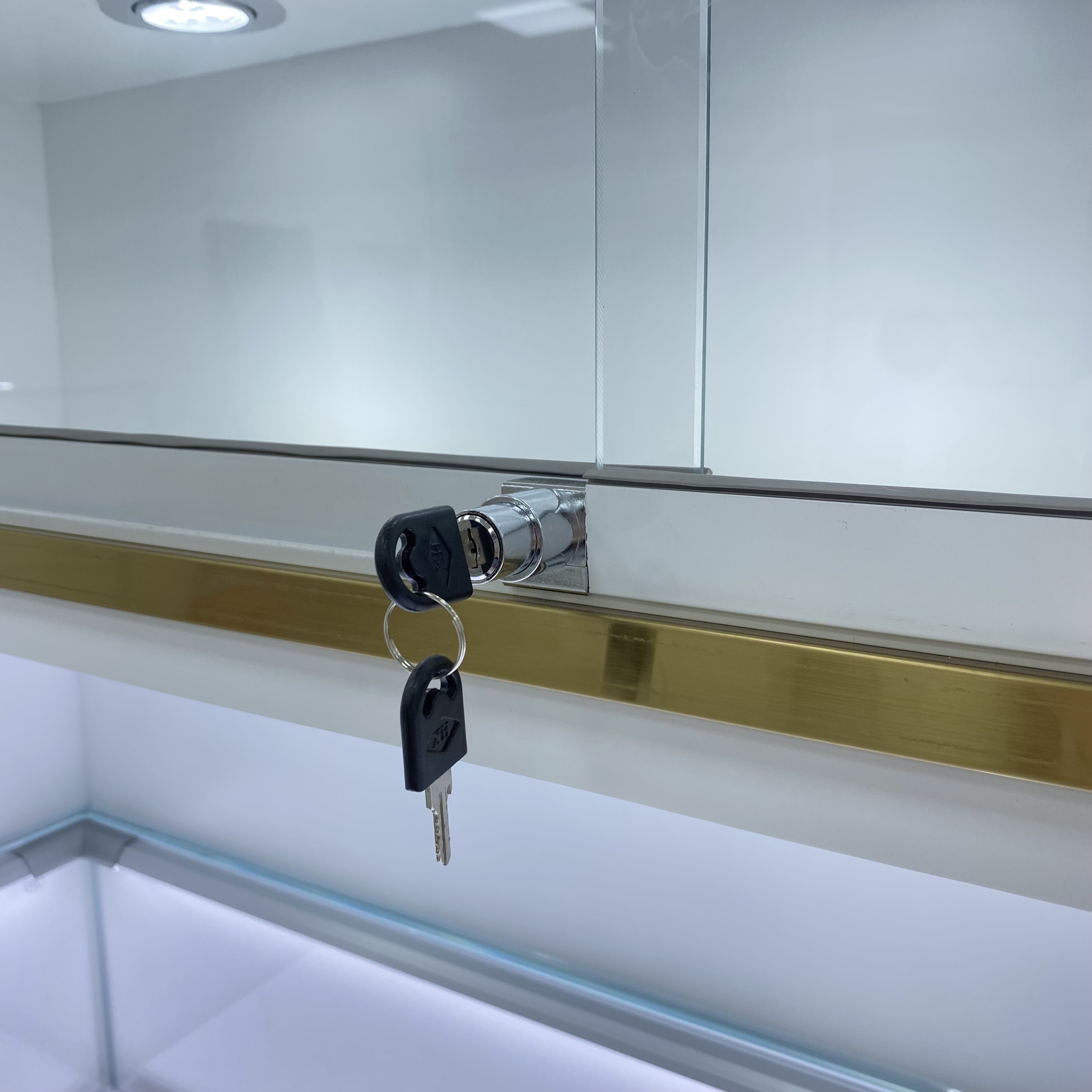 The interior of the display cabinet is equipped with high-quality safety locks, such as password locks, fingerprint locks, etc., to ensure the safe storage of jewelry. At the same time, some display cabinets also have built-in alarm systems. Once someone tries to illegally open the display cabinet, the system will immediately sound an alarm to effectively prevent theft.